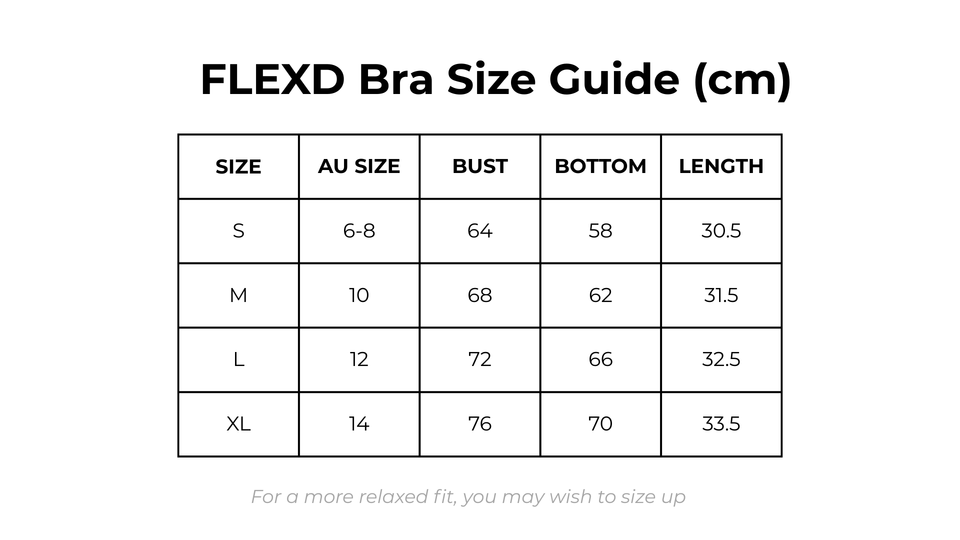 FLEXD bra size guide chart with size, AU size, bust, bottom, and length measurements for sizes small to extra large.